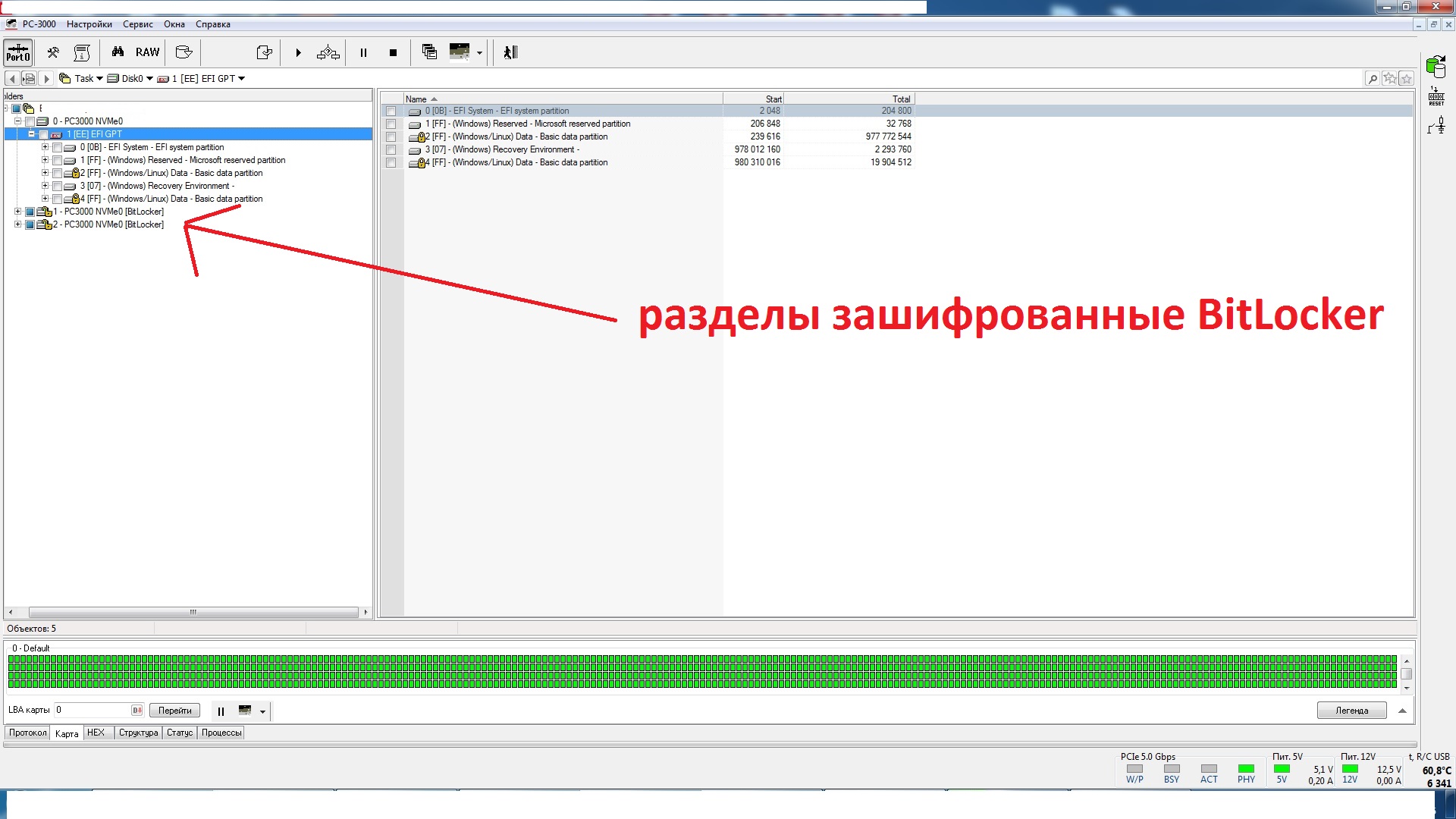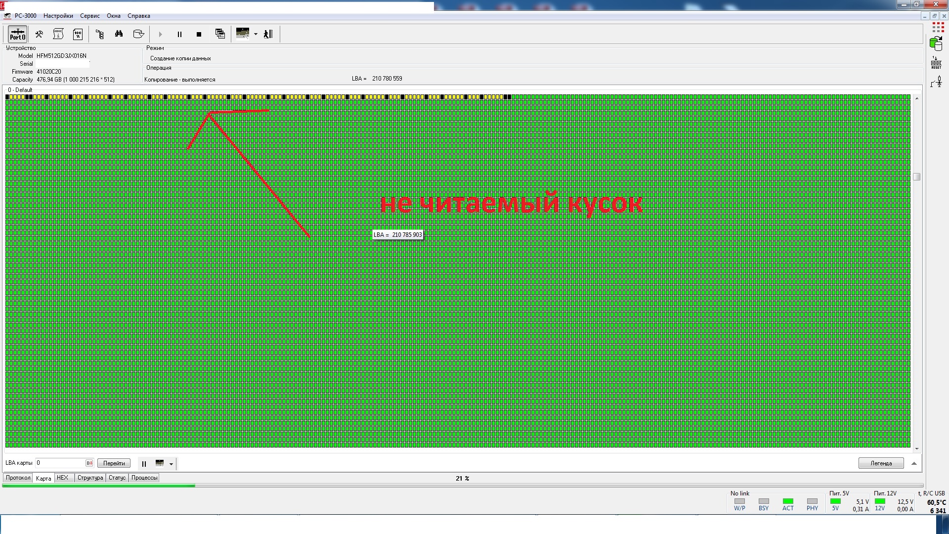 При попытке расшифровать разделы, накопитель естественно пытается прочитать информацию с разных мест раздела и нарывается на не читаемые сектора из-за зависаний SSD. В общем, было принято решение, сначала отчитать по максиму накопитель и только потом заниматься расшифровкой данных.