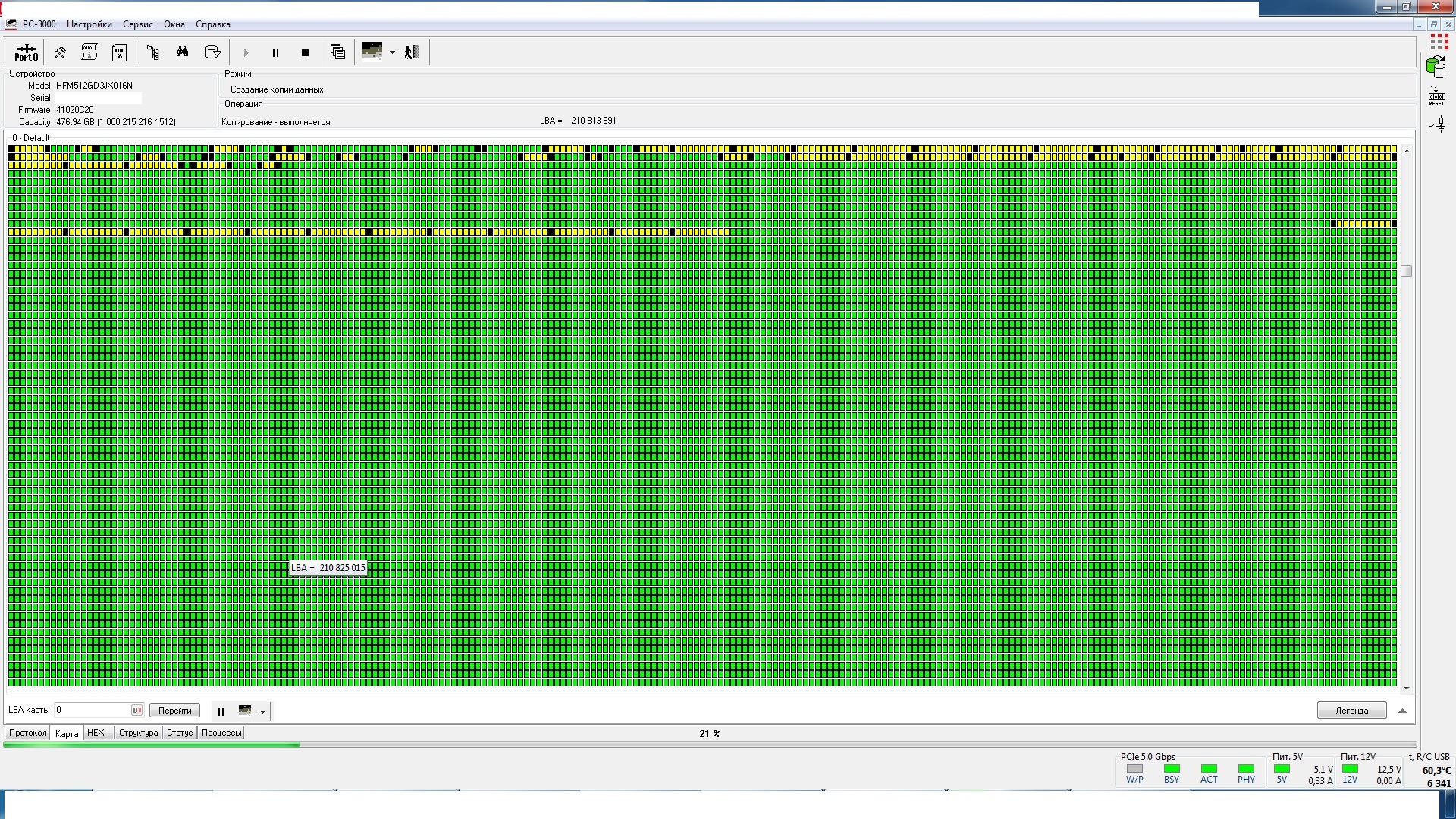 После диагностики выяснилось, что накопитель сразу после подачи питания, читает несколько тысяч секторов и зависает, дальнейшее чтение возможно, только после снятия и подачи питания. Ко всему прочему на данном накопителе еще и зашифрованы разделы BitLocker.